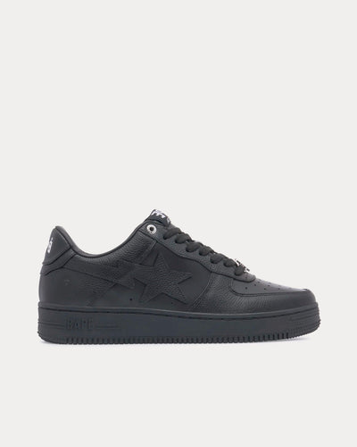 low top sneakers feature leather uppers, chunky soles with Bape branding, and a metallic Bape pendant logo on the front laces. Made in China.