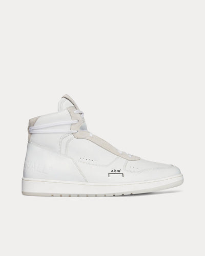 The men's A-Cold-Wall* Luol high top sneakers in white are crafted from leather and feature a custom satin finish leather developed with ECCO, TR rubber soles, raw edge top stitched construction, padded reinforced ankle and eyestay., A-COLD-WALL* large blind debossed logo at heel., ACW* bracket logo debossed and printed at toe box., and double hand stitch details on heel panel.