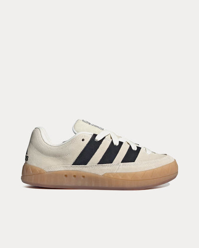The unisex Adidas Adimatic low top sneakers in off white, core black, and gum feature suede uppers, curved 3-Stripes complemented by zigzag graphics on the midsole and heel tab.