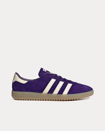 The unisex AdidasBermuda low top sneakers in collegiate purple, cream white, and dark purple feature premium suede uppers, serrated 3-Stripes and translucent gum rubber tooling.
