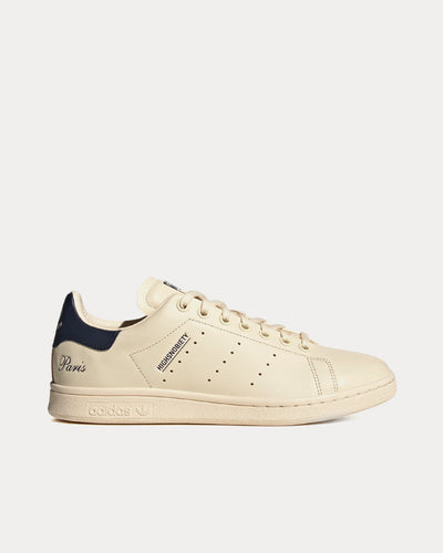 The unisex Adidas x Highsnobiety Stan Smith low top sneakers in wonder white and cream white are inspired by retro tennis court shoes and feature premium tumbled leather uppers, perforated 3-Stripes, a branded heel tab, finished with a debossed and printed Highsnobiety logo, co-branded details on the sockliner, heel and tongue and a "Highsnobiety in Paris" keychain.