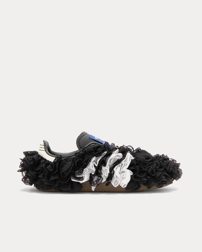 The unisex Adidas x Reverie by Caroline Hú Samba low top sneakers in black feature ruffled lace uppers, satin lining, material accents, and stitch details.