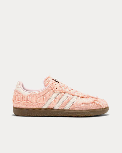 The unisex Adidas x Reverie by Caroline Hú Samba low top sneakers in pink feature textured silk uppers, satin lining, material accents, and stitch details.