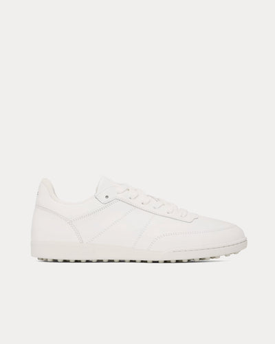 The women's A.P.C Moe low top sneakers in white are crafted from faux-leather and feature panels with tone-on-tone topstitching, raised A.P.C. MOE logo on the exterior side of the soles, flat laces, and dotted soles.