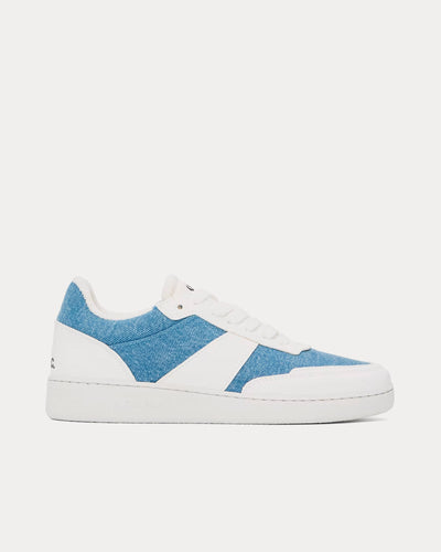 The women's A.P.C Plain low top sneakers in white and light blue are crafted from buffed faux-leather and denim and feature perforated toe details, logo embroidered on the padded tongue, terrycloth lining logo embossed on the midsole, and treaded rubber soles. Made in Portugal.