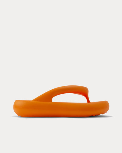 in orange are made from bio-based EVA and feature the 'Arigato' logo molded into the sole, minimal straps, and a rounded platform base.