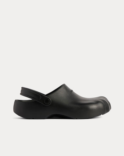 The men's Balenciaga Sunday Moudled mules in black are crafted from rubber & EVA and feature a fully molded design, five toe anatomical shape, sliding straps with BB logo on each side, and the Balenciaga logo embossed on the uppers.