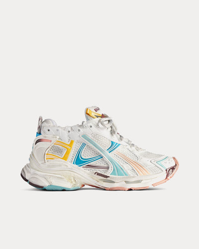 The women's Balenciaga Runner low top sneakers in white, yellow, pink, and blue mesh and nylon are leather free with a worn-out effect, printed size at the edge of the toe, embossed size at back, Runner logo printed on exterior, Balenciaga logo embroidered on the tongue and Balenciaga logo at the back of the heel. Made in Italy.