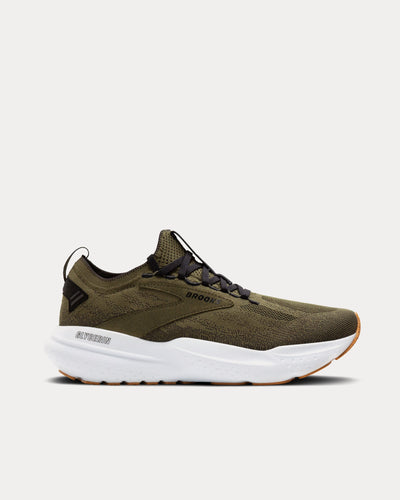 The men's Brooks Running Glycerin StealthFit 21 running shoes in green, black, and white are designed for road running and feature sleek uppers that delivers a streamlined look and near-seamless fit, an ultra plush ride with soft DNA LOFT v3 cushioning. Made from recycled materials.