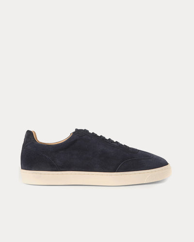 The men's Brunello Cucinelli Coda di Rondine low top sneakers in navy feature velvety suede uppers, natural latex outsoles, flat fabric laces, a minimal design, and leather lining. Made in Italy.