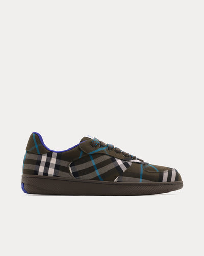 The men's Burberry Check Terrace low top sneakers in snug features mesh uppers in Burberry check, check laces, rubber soles moulded with archive Burberry lettering, and Equestrian Knight Design label at tongue. Made in Italy.