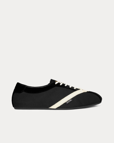 The women's Celine The Flat sneakers in Black and White reinterpret a classic low-profile court silhouette with a luxe, multi‑material construction in gros grain, velvet, suede goatskin, and lambskin. The upper is detailed with an embroidered Triomphe logo on the back, a side label printed with CELINE, and debossed CELINE branding under the rubber outsole, while a removable Triomphe lace accessory adds an extra hit of house identity.