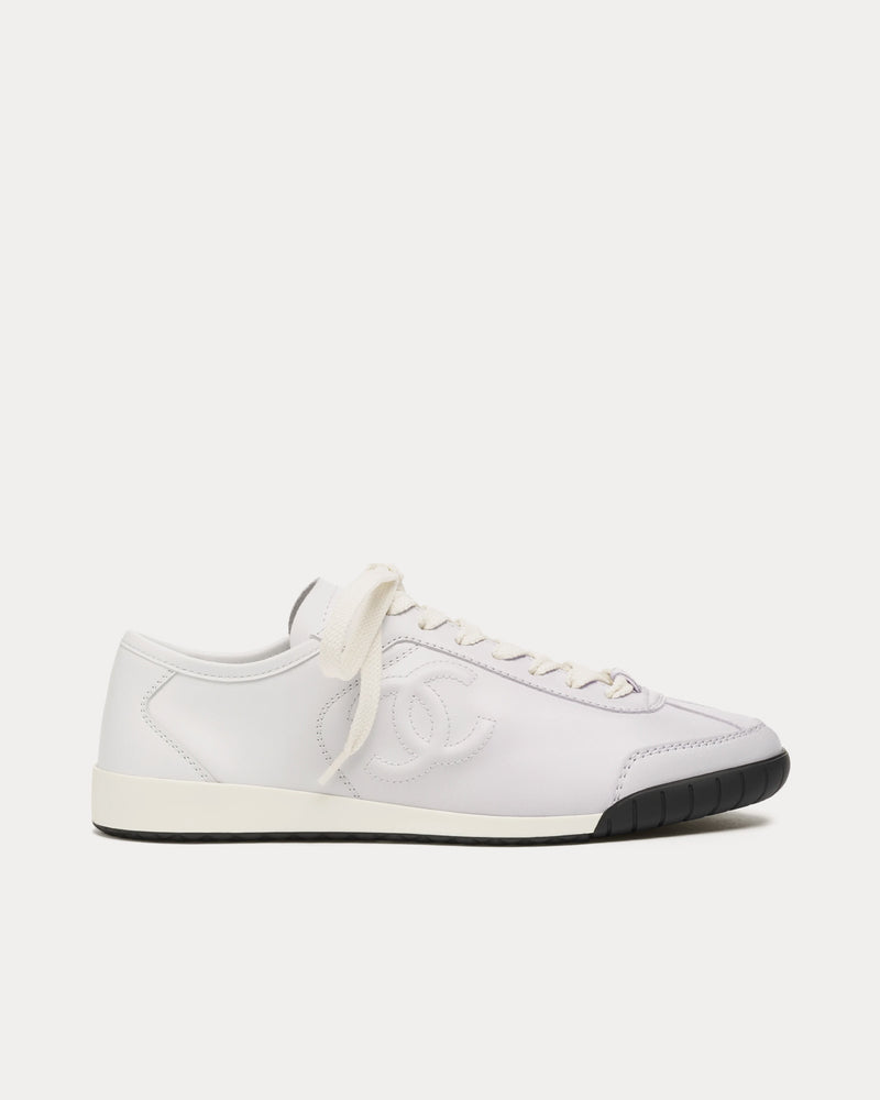 The women's ChanelPrinted Calfskin low top sneakers in light purple feature leather uppers with Chanel logo on sides, Chanel logo on tongue, and rubber soles.