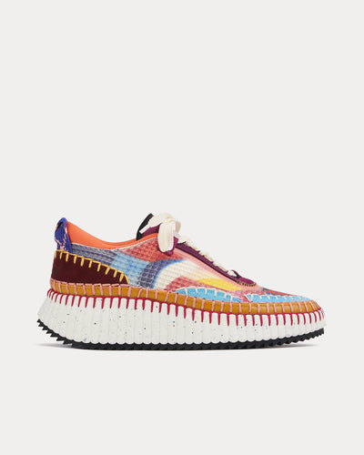 Caroline Denervaud for Chloé Nama low top sneakers in multicolour red feature a bold, lightweight structure with a hand-stitched mesh upper, showcasing authentic Chloé craftsmanship. The eco-designed Nama sneakers are crafted from a rich mix of materials with 40% of its weight made up of recycled debris.