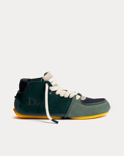 The men's Dior Roadie boots in Green Nubuck with Green and Navy Blue Suede stand as a signature from Jonathan Anderson’s debut show, blending vintage driving-shoe cues with a bold tubular sole for a technical, high-impact silhouette. Crafted from nubuck and suede calfskin with a soft lambskin lining, the high-top features an embroidered Dior signature on the side, embossed Dior logos on the tongue and heel, and a padded collar for comfort.