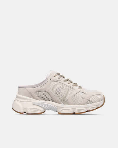 The women's Dior Chrono sneaker mules in Beige Mesh and Suede Calfskin offer a fresh, open-back twist on the iconic running silhouette—seamlessly blending Dior’s couture codes with laid-back functionality. Designed with an open heel for effortless slip-on wear, this refined mule style brings contemporary elegance to everyday comfort.