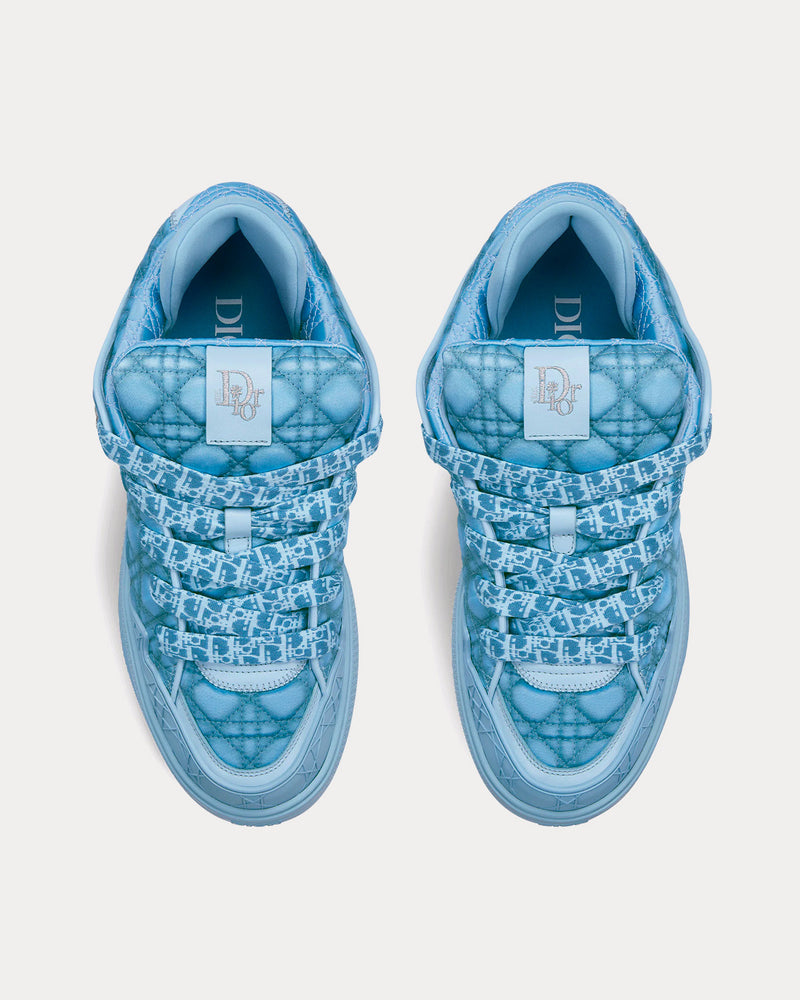 A key piece of the exclusive DIOR BY ERL collaboration, the new B9S is inspired by skater codes and the House's couture spirit. Crafted in blue Kumo Cannage satin, it offers a quilted version of the hallmark motif. The padded tongue and technical fabric support sock offer optimal comfort. A DIOR BY ERL floral motif is embroidered with metallic thread on the back, while the front is adorned with a tonal rubber insert featuring the Cannage motif. Completed by a rubber sole engraved with a gradient Dior Oblique motif, the skate sneaker will lend the finishing touch to any look and can be coordinated with other DIOR BY ERL creations.