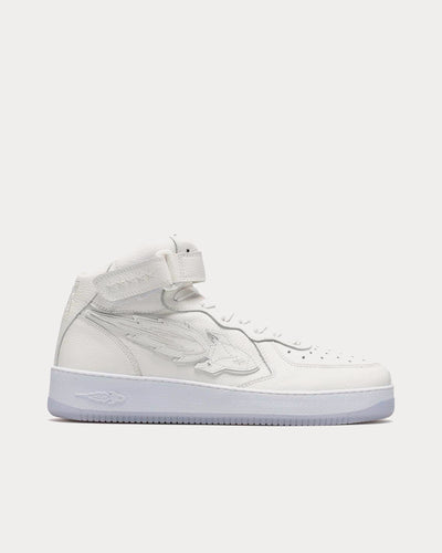 These sneakers are from Enterprise Japan, a brand new collaboration between designer Domenico Formichetti and Italian popstar Sfera Ebbasta. The Mid sneakers, here in white, feature a leather upper, velcro strap detail at ankle, mesh lining and a rubber sole.