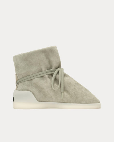 The unisex Fear of God Alaska Moc high top sneakers in salvia are Native American-inspired and feature soft Italian suede uppers, wrapped laces for adjustability, suede fringes, a Fear of God black bar label on the heel, and rubber moc outsoles. Made in Italy.