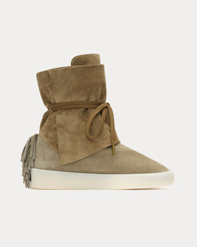 The unisex Fear of God Yuma Moc high top sneakers in deer are Native American-inspired and feature soft Italian suede uppers with an overlapping suede front, wrapped laces for adjustability, suede fringes, a Fear of God black bar label on the heel, and rubber moc outsoles. Made in Italy.