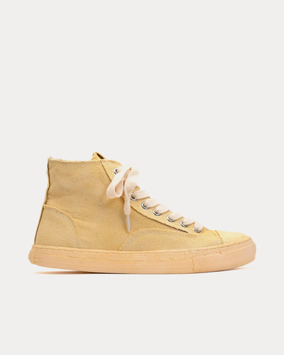 The men's General Scale By Maison Mihara YasuhiroPast Sole overdyed canvas sneakers in beige are inspired by 'bringing time back to life by recreating the beauty of a bygone era'. The high top sneakers feature an organic cotton upper that has been overdyed and an insole made with bamboo material. Made in China.