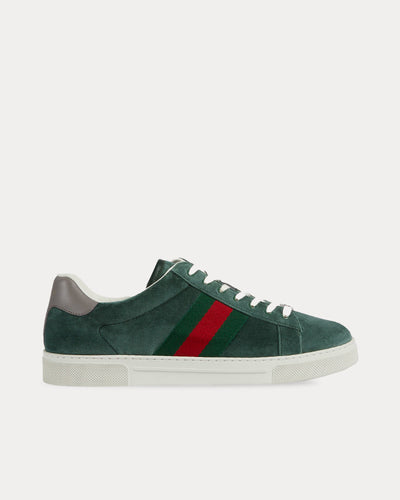 The men's GucciAce with Web low top sneakers in green velvet and feature a low-top silhouette, velvet uppers, metal “ACE” tag atop the lace-up closure, and Gucci's distinctive green and red Web stripe. Made in Italy.