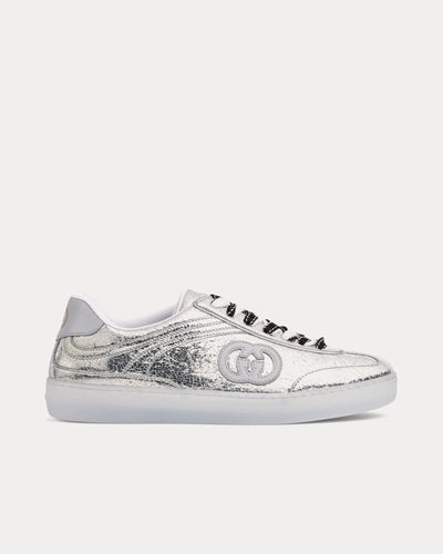 The women's Gucci G75 sneakers in Silver pay tribute to classic '70s basketball aesthetics while incorporating elevated details signature to Gucci. Crafted in textured leather, the low-top silhouette features perforated leather inserts that add both breathability and vintage-inspired texture.