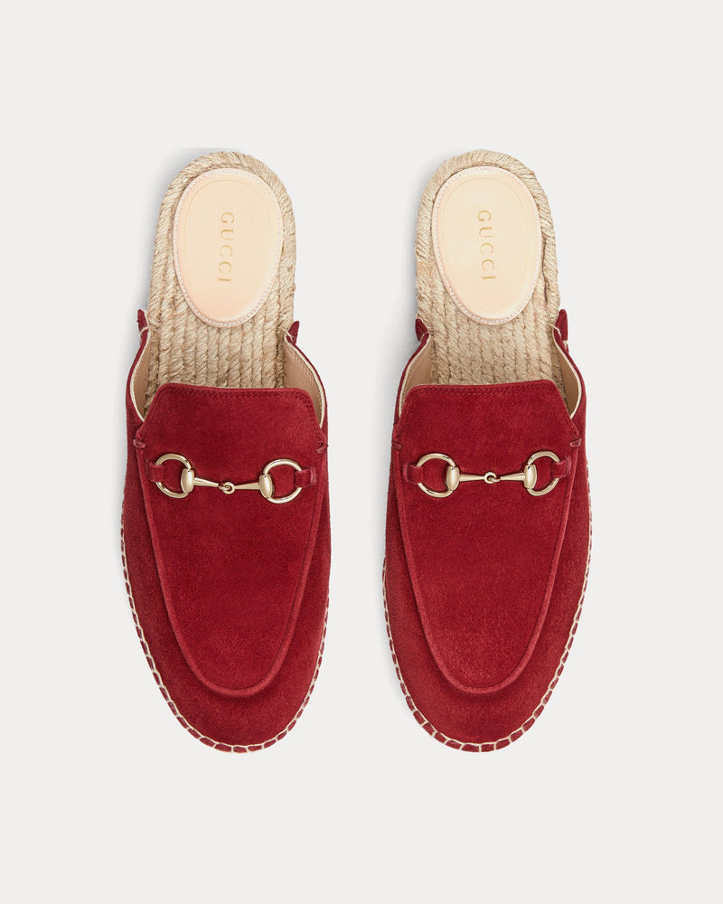 The women's Gucci Horsebit Suede Espadrille Mules in Rosso Ancora blend classic heritage with effortless elegance. Crafted in refined suede, these slip-on mules are elevated by Gucci’s iconic Horsebit hardware in light gold tone, a nod to the brand’s rich equestrian roots.