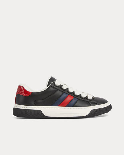 The women's Gucci Screener low top sneakers in black are based on classic 1970s designs and feature lightweight leather uppers with a chunkier design, blue and red Web, maxi 'ACE' metal tag, rubber soles, and chunky laces. Made in Italy.