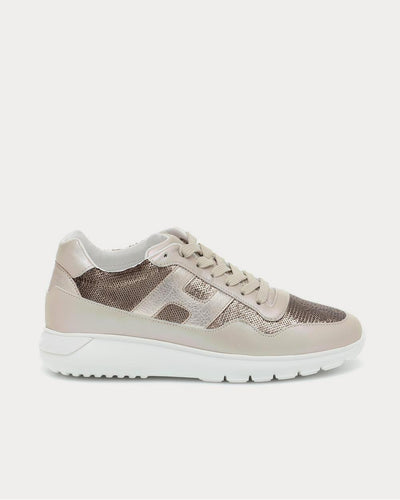 The Interactive³ leather sneakers from Hogan fuse function and form. Because they have ergonomic rubber soles, your feet will feel supported, whether strolling on your staycation or commuting to the office. This pair is especially glamorous, with uppers made from metallic champagne-hued leather and scores of rose-golden sequins.