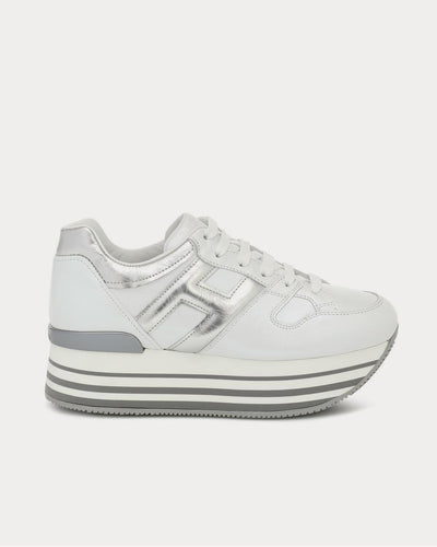 Hogan’s beloved H222 silhouette receives an exaggerated makeover with these white Maxi sneakers. Made in Italy from buttery calf leather, they feature metallic-silver overlays – including H insignia at the sides – and are set on nostalgic striped-rubber platform soles.