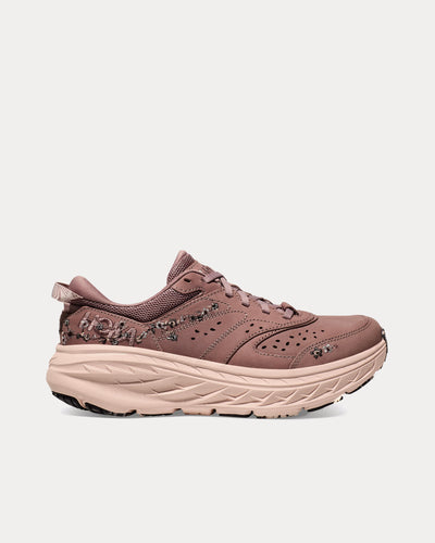 The unisex HOKA Bondi L 'Vibrant Bloom' running shoes in quartzite and smoky quartz are designed for everyday lifestyle & walking and feature streamlined grain leather and mesh uppesrs, early stage MetaRocker™ geometry, full-length EVA midsoles, and a beveled heel design for smooth transition and increased durability.