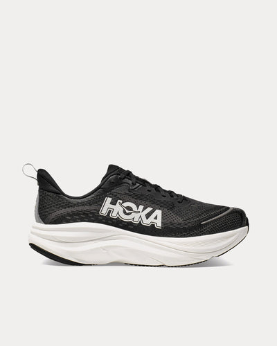 The men's HOKA Skyflow running shoes in black and white are designed for road running and feature a sleek collar construction, creel jacquard uppers with reflective flash film details, dual-gussetted tongue, SCF EVA midsoles, heel-focused Active Foot Frame™ and early stage MetaRocker™.