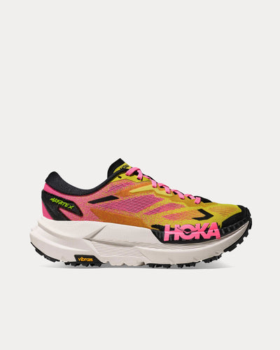 The women's HOKA Mafate X running shoes in Hoka Neon Citrust and Neon Rose are engineered for the most demanding trail runners, whether you're racing ultras, grinding gravel, or tackling technical terrain. Designed for long-haul performance, the Hoka Mafate X combines maximum cushioning, responsive propulsion, and durable grip for a high-performance trail experience.