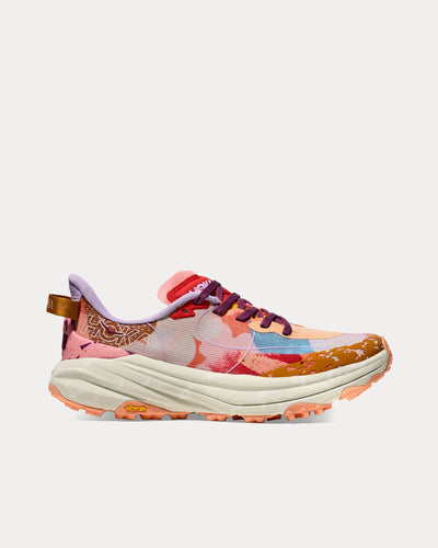 The unisex HOKA x Studio Proba Speedgoat 6 running shoes in Cadmium Orange and Whisper Green transform trail performance into wearable art through the bold, joyful vision of artist Alex Proba.