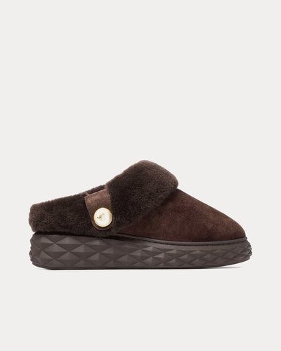 The women’s Jimmy Choo Diamond Maxi Mule F slip-ons in Suede Shearling Chocolate and Chocolate are crafted from luxurious tonal suede and lined with warm shearling for ultimate comfort. These elegant mules feature the signature diamond-patterned sole, offering maximum grip and a distinctive aesthetic. Embellished with JC monogram-embellished pearl buttons at the upper, they showcase delicate detailing synonymous with Jimmy Choo’s refined style.