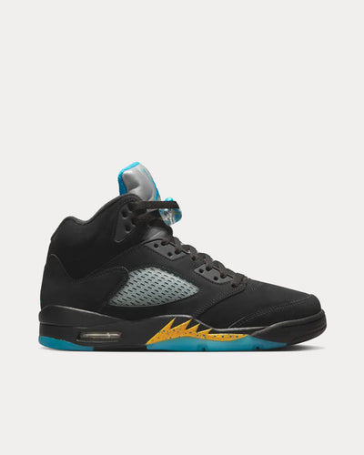 The AJ-5 "Aqua" is back, completing any look you desire. This shoe pays tribute to the highly sought after AJ-8 colorway from 1993, featuring vibrant pops of Aqua and Taxi on a Black background. The shoe's unique features such as the spiky midsole, side vents, and lace lock pay homage to the original design, making these sneakers the perfect addition to your collection.