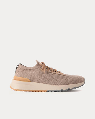 The men's Brunello Cucinelli Knit Runner low top sneakers in beige are crafted from cotton knit and feature light knit uppers with semi-polished calfskin trims, ultra lightweight EVA micro rubber soles, and detachable insoles. Made in Italy.