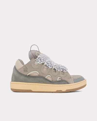 The women's Lanvin Curb low top sneakers in grey are inspired by the 90s sneaker designs and feature nappa calfskin, suede and mesh uppers, a rounded shape, metallic eyelets, quilted tongue with Lanvin label and embossed Mother and Child logo, and double waxed and woven herringbone laces. Made in Italy.