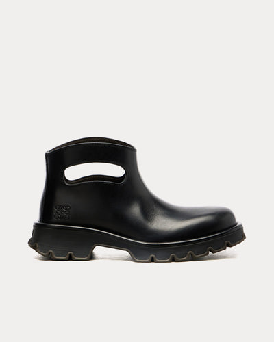The women’s Loewe Bobby Bootie Boots in Black are meticulously crafted in Italy from vegetable-tanned calfskin. These ankle boots stand out for their striking handle cut-out, creating a sculptural detail designed for both style and functionality. The design merges workwear inspiration with high fashion, featuring a reinforced toe, chunky two-piece sole, and a leather-covered welt for durability and edge. Tonal Anagram detailing is embossed on the heel, and a moulded LOEWE logo appears on the rugged outsole.