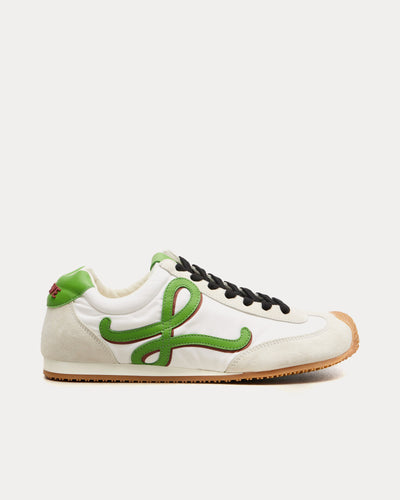 The women's Loewe x Louis Wain Ballet Runner 2.0 sneakers in White and Green blend elegance with sporty innovation, offering a sleek, lightweight silhouette. Crafted from nylon and calfskin, this refined sneaker features an asymmetrical toe shape and a sock-like internal structure for a snug, comfortable fit.
