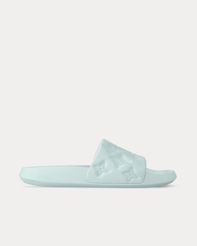 The men's Louis Vuitton Waterfront mules in sea green are crafted from waterproof rubber and feature Monogram-embossing on the uppers, anatomic insoles for comfort, lightweight & flexible outsoles, and front straps. Made in Italy.