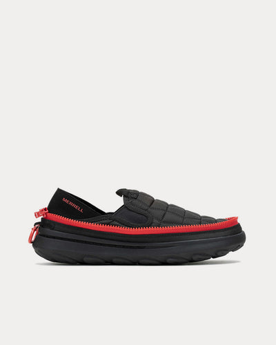 The men's Merrell Hut Moc 2 Packable slip on sneakers in Black and Lava feature nylon ripstop uppers with zipper allowing the two shoes to zip together as one, bungee laces with toggle closure for a secure fit, carabiner included to clip and go removable outer shrouds and durable water repellant treatment.