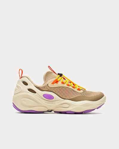 The men's Merrell 1TRLMoc Speed Streak Evo low top sneakers in khaki and multi feature Breathable mesh and TPU uppers, FloatMax midsoles, an added rubber outsole for traction and durability, and are Vegan friendly.