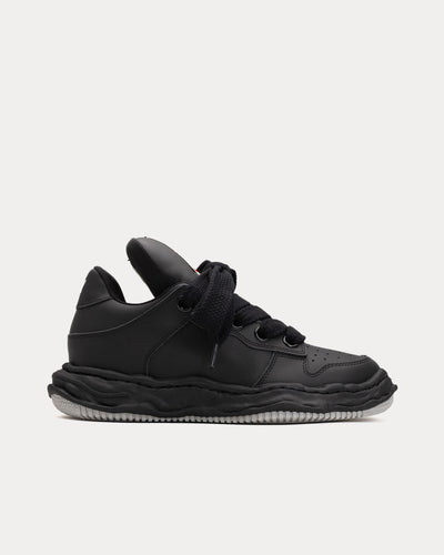 The men's Mihara YasuhiroWayne Puffer OG Sole low top sneakers in black and black feature leather uppers, "MMY" design on upper and counter, thick laces, contrasting pannelling, vintage finish on upper and sole, and a crafted sole. Made in Japan.