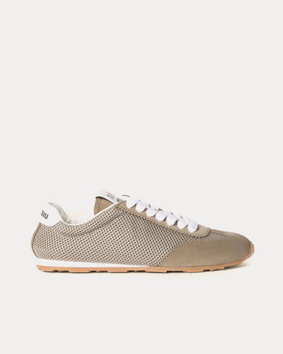 The women's Miu Miu Plume sneakers in Clay Grey combine refined craftsmanship with a sleek, ultra-light design. Made in Italy, these sneakers feature a luxurious mix of mesh, suede, and leather, offering both breathability and sophistication.