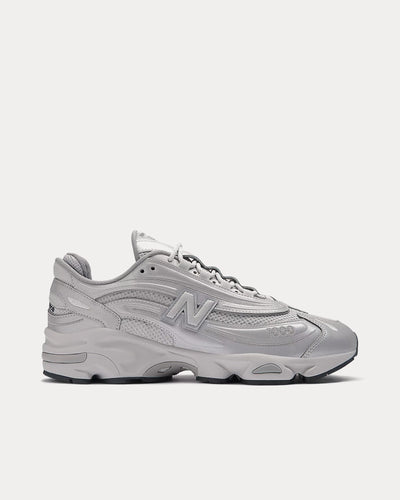 The unisex New Balance 1000 low top sneakers in silver metalic with raincloud feature mesh underlays, synthetic overlays, combination polyurethane and ABZORB midsole, with ABZORB cushioning at heel and forefoot, stability web, sculpted midsole details, embroidered details, reflective accents, and rubberized ‘N’ logo with transparent outline.