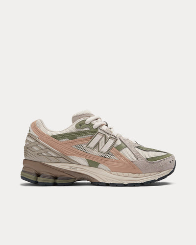 The unisex New Balance 1906 Utility low top sneakers in linen with dark olivine and flat taupe are inspired by running shoe designs from the 2000s and feature ACTEVA LITE midsoles, ABZORB SBS heel cushioning, N-ergy outsole for superior shock absorption, and Stability Web outsole technology to provide added arch support.