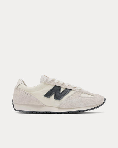 The unisex New Balance 471 low top sneakers in Linen with Angora and Black transform ‘70s running heritage into a modern everyday staple, featuring a sleek low profile, wedge-shaped EVA midsole, and classic herringbone outsole. Breathable mesh uppers and hairy suede overlays create an effortlessly lived-in look, while the signature ‘fang’ toebox overlay pattern, inspired by the original 320, adds a distinct New Balance touch. An exposed foam tongue provides an era-authentic, ‘unfinished’ aesthetic, complemented by leather ‘N’ logos and leather accents at the collar and heel.