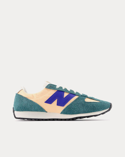 The unisex New Balance 471 low top sneakers in New Spruce with Peach Blossom and Team Royal transform ‘70s running heritage into a modern everyday staple, featuring a sleek low profile, wedge-shaped EVA midsole, and classic herringbone outsole. Breathable mesh uppers and hairy suede overlays create an effortlessly lived-in look, while the signature ‘fang’ toebox overlay pattern, inspired by the original 320, adds a distinct New Balance touch. An exposed foam tongue provides an era-authentic, ‘unfinished’ aesthetic, complemented by leather ‘N’ logos and leather accents at the collar and heel.